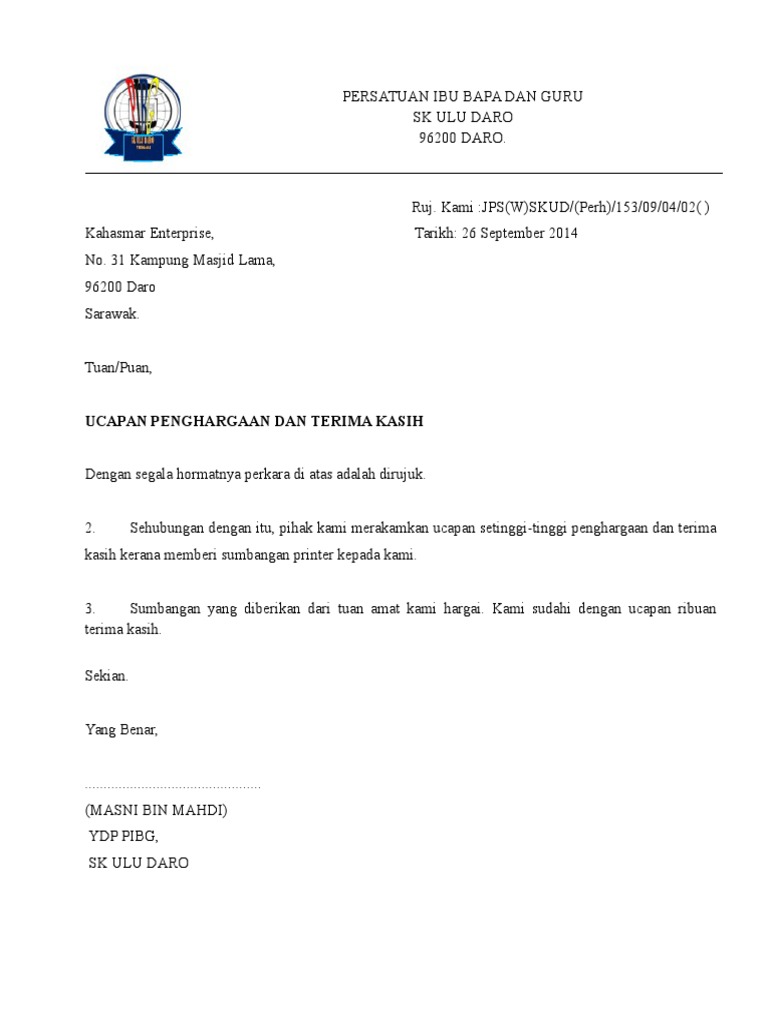 Related : Surat Penghargaan Dan Terima Kasih - Surat terima contoh kasih rasmi penghargaan dan ucapan atas sumbangan ceramah ribuan tahniah kepada quran sekolah khatam dewan buku urdu..