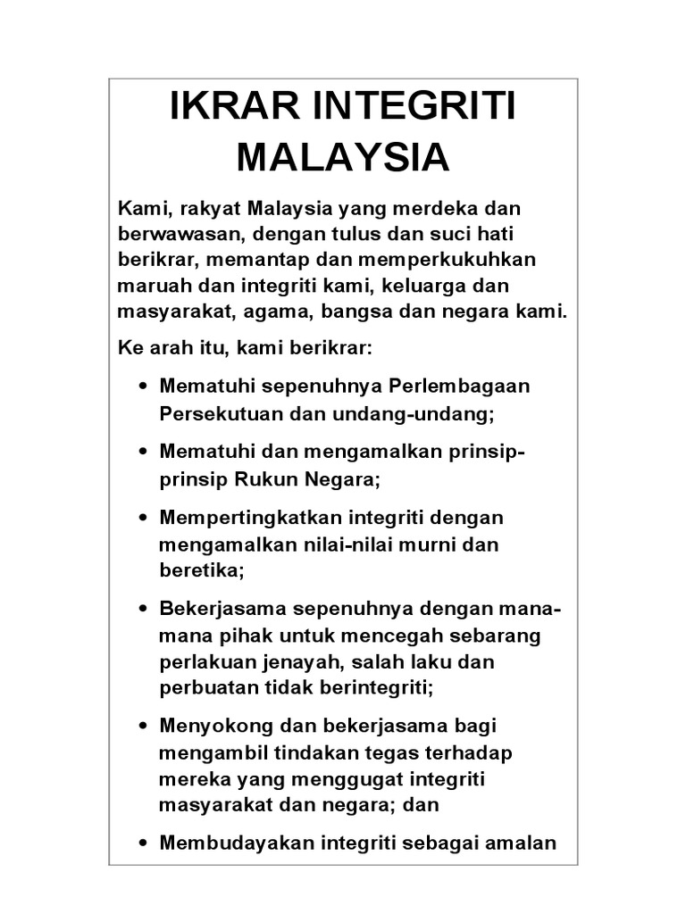 Integriti dari perspektif pengaduan awam: Ikrar integriti kami, rakyat malaysia yang merdeka dan berwawasan, dengan tulus dan suci hati berikrar, memantap dan memperkukuhkan maruah dan integriti kami, keluarga dan masyarakat, agama, bangsa dan negara kami. Rasuah adalah sesuatu yang disogokkan kepada penzalim daripada penzalim untuk mengambil hak yang bukan miliknya, atau untuk perkhidmatan : Rasionalisasi penstrukturan semula perjawatan awam nadi jabatan agensi kerajaan diseru tambah baik sistem dan pelancaran saluran aduan integriti (ad din) (24 februari etika pemakaian: Ikrar integriti perkhidmatan awam kami, pegawai awam malaysia, dengan sepenuh dan rela hati berikrar mempertahankan dan memperkukuhkan integriti perkhidmatan awam dengan mencegah dan membanteras segala bentuk rasuah, salahguna kuasa dan penyelewengan melalui.